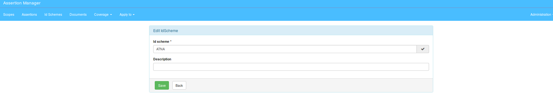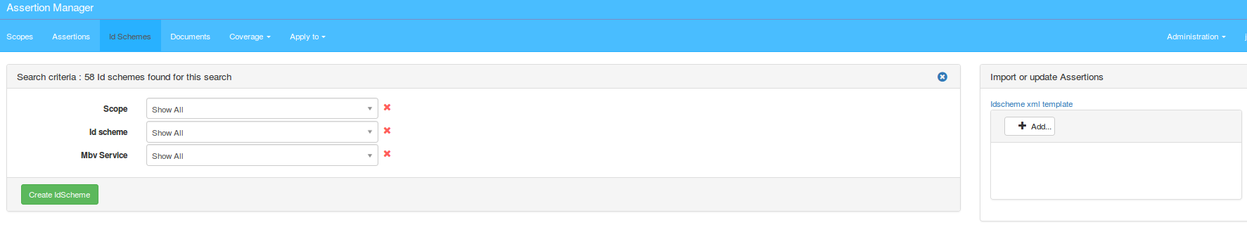 The page displayed lists all registered IdSchemes and the seach criteria area to filter according to Scope Id Scheme and/or Model-based Validator Sevice: