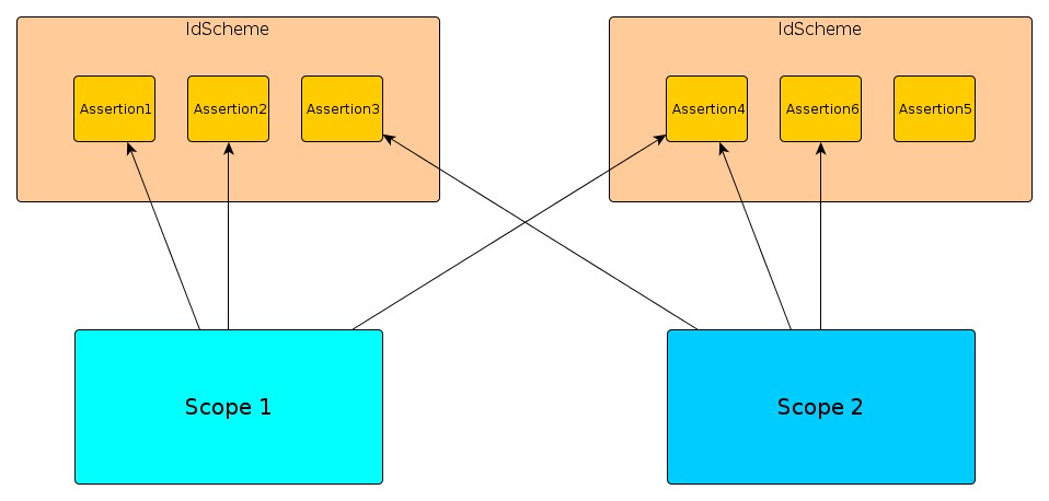 A scope contains assertions and one assertion can be in 0 or multiple scopes.