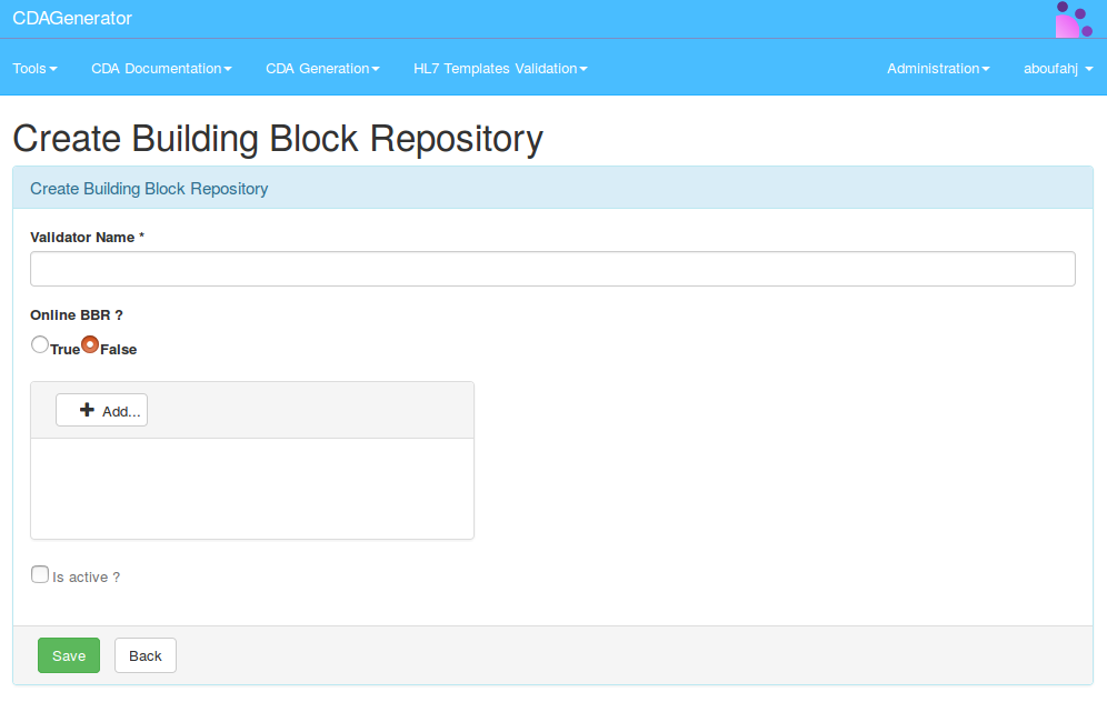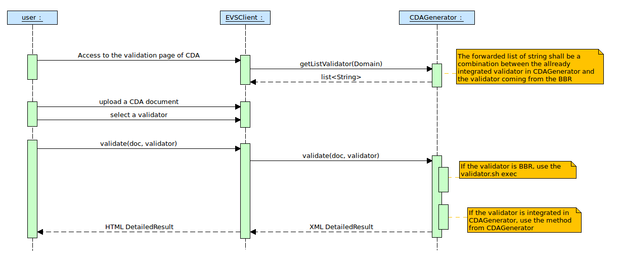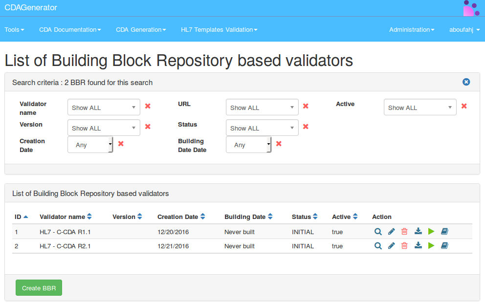 When a BBR is added, its name is used in the validation service in EVSClient (if it is active). The filtering of the BBR in EVSClient is based on the same principle of filtering as the other validators, if the name of the BBR contains a word coming from the referenced standard in EVSClient, it is proposed as a validator by CDAGenerator
