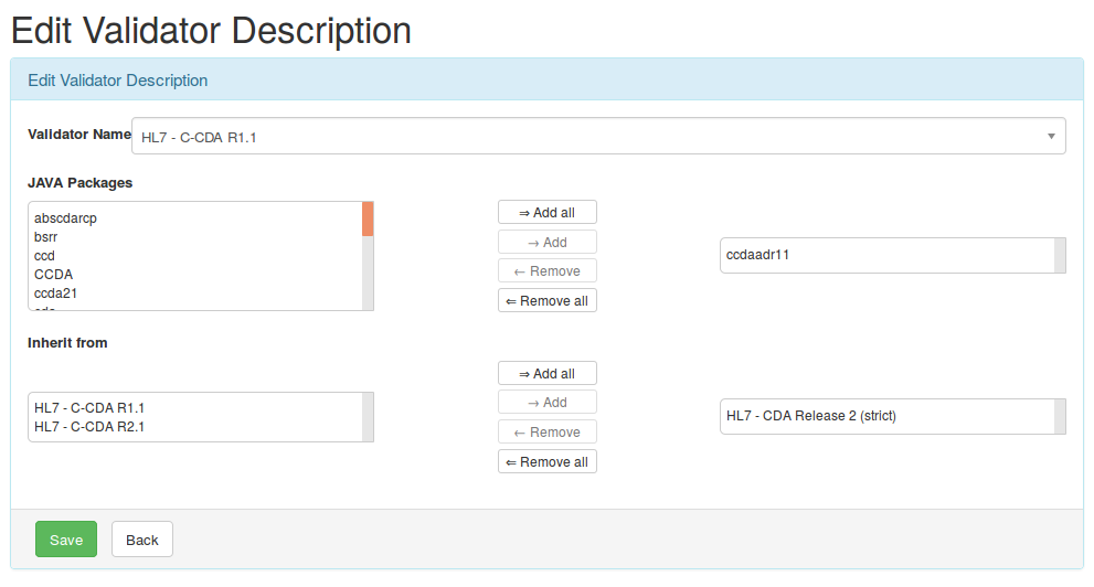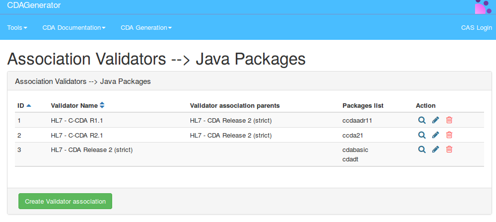 This page is for the administrators of the tool. It represents an association between validators and packages of documentation. For each association we have an id, the validator name, the list of the validator’s parents and the list of packages directly related to the validator. The complete list of packages related to a validator is the concatenation of the direct related packages, and the sum of all the packages list related to the parents, grand-parents (and so) of the validator. You can create a new validator association by clicking on the button “Create Validator association”.