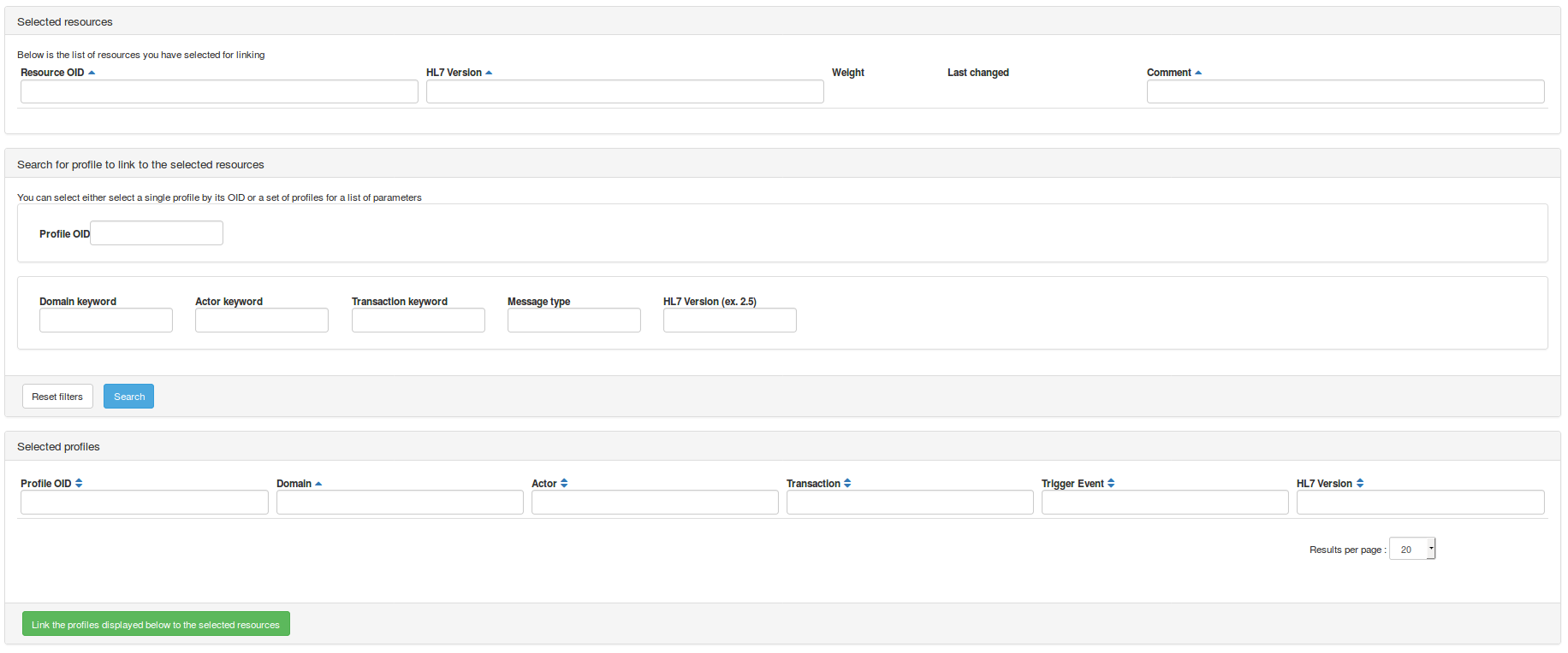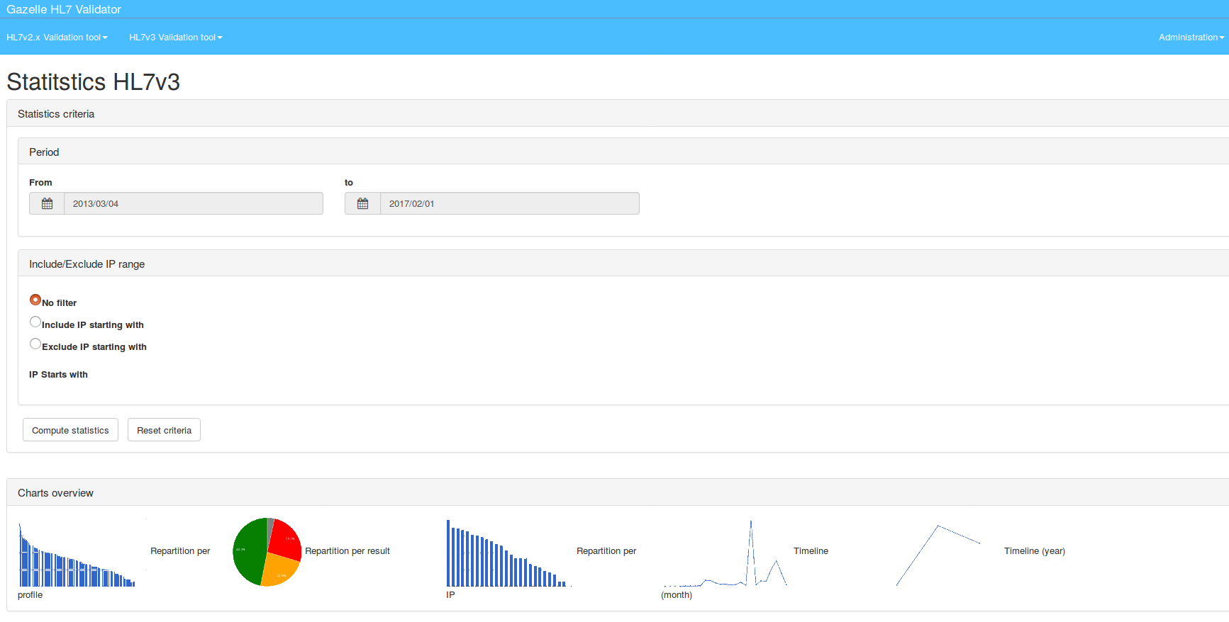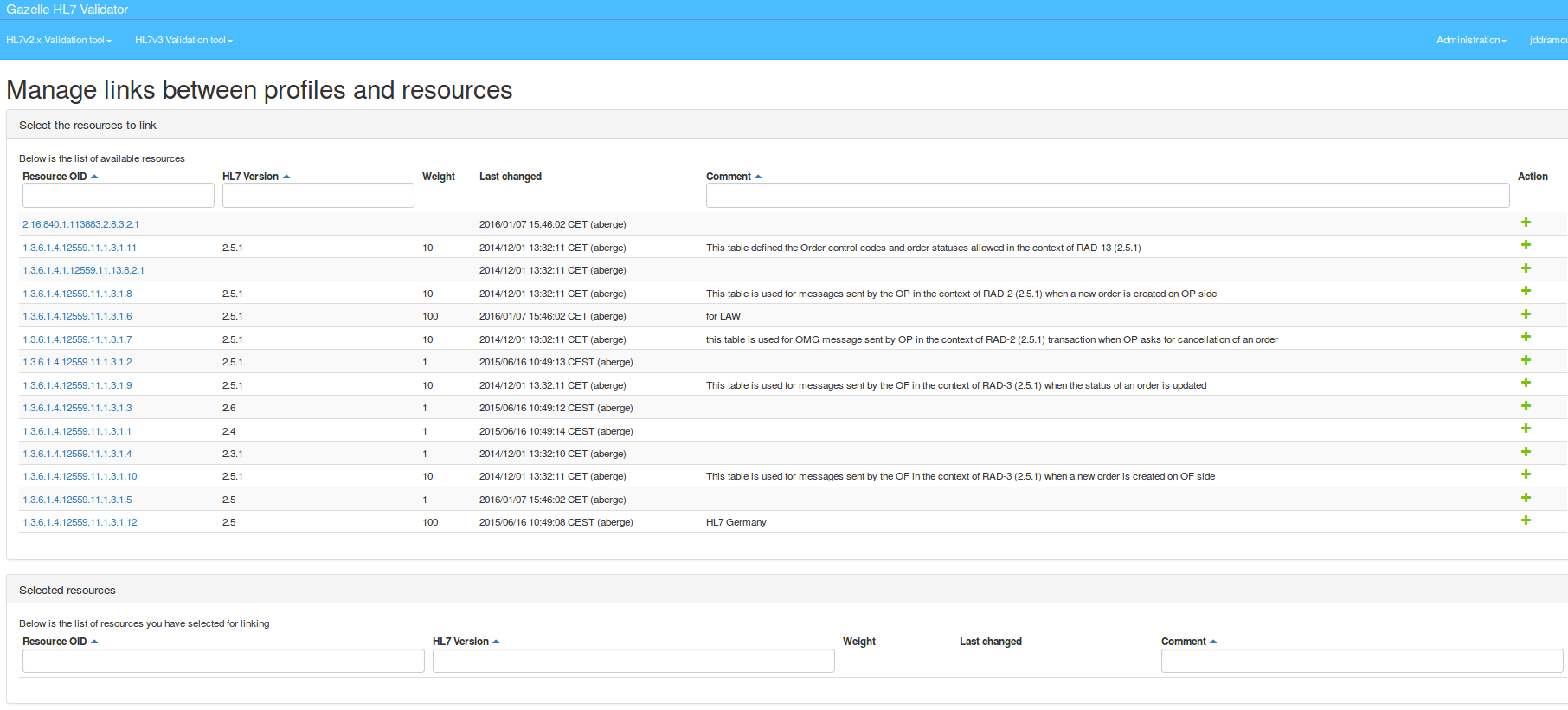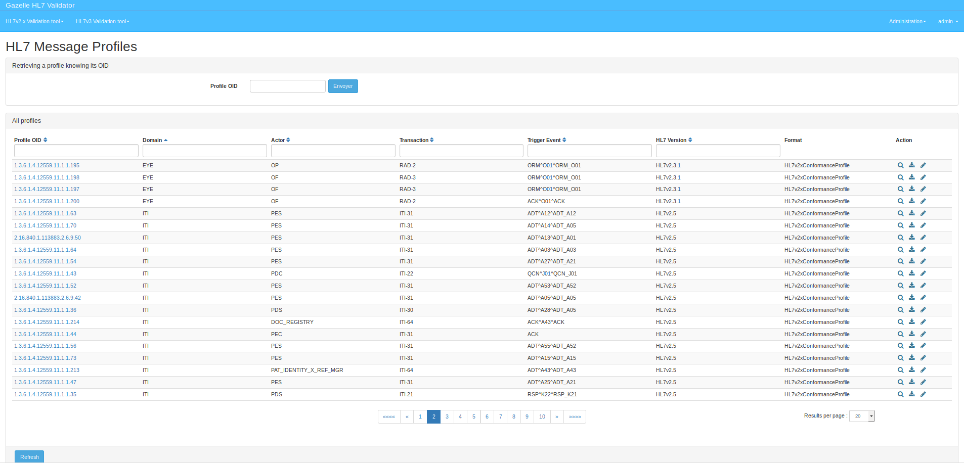Concerning HL7v2 validation: the application also gathers the HL7 conformance profiles and the HL7 tables (codes) which can be browsed by any user. For each conformance profile, you will find information about its issuer (actor, domain, transaction) and the message type and HL7 version. Each conformance profile can be bound to one or several HL7 tables which gather a list of allowed values for a given field of the message.