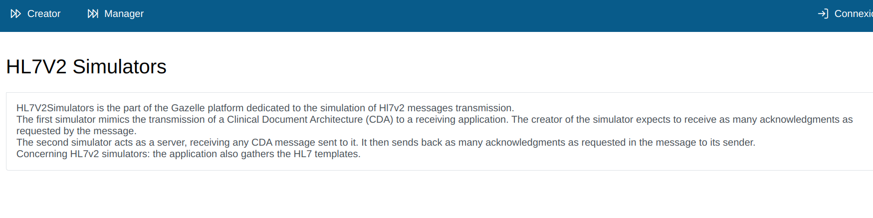 The Creator Simulator simulate the transmission of a Clinical Document Architecture (CDA) to a receiving application.