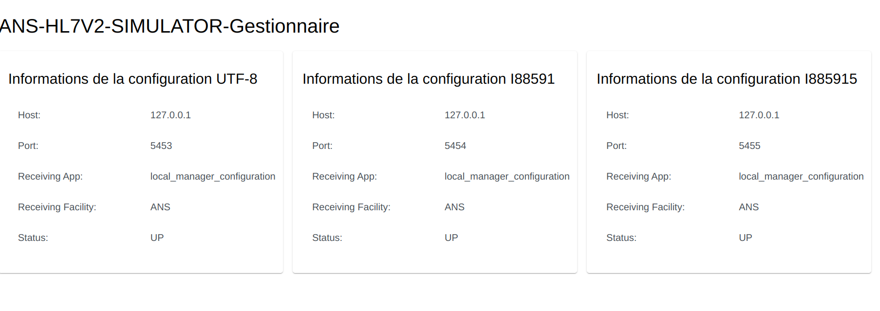 Three simulator acts as a server with different charset handled. For every CDA messages received, they send back as many acknowledgments as requested in the message to their sender.