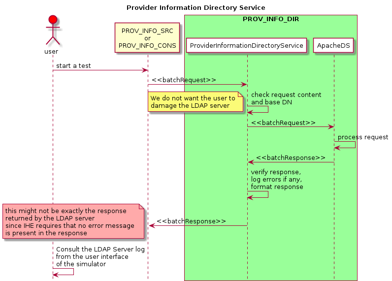 The received request may raise errors in ApacheDS which will be reported in the batchResponse returned by the tool; in that case, the error is stored in our database and the response is formatted to fit IHE requirements (no error message are sent back to the sender).