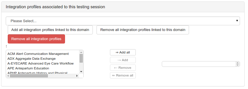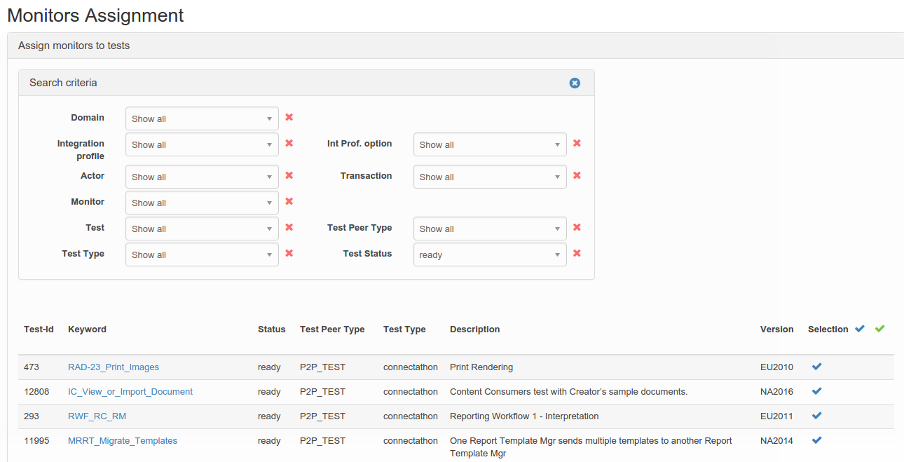 When you edit the test assignments of a monitor, the list of already assigned tests is displayed, you can remove some of them by hitting the red cross. If you want to add some more, use the “Edit Test Assignment” button, il will open a new panel. You can filter the test either by domain, integration profile or actor. First select the criteria type, then select one domain or integration profile or actor and pick up the tests to assign to the current monitor.