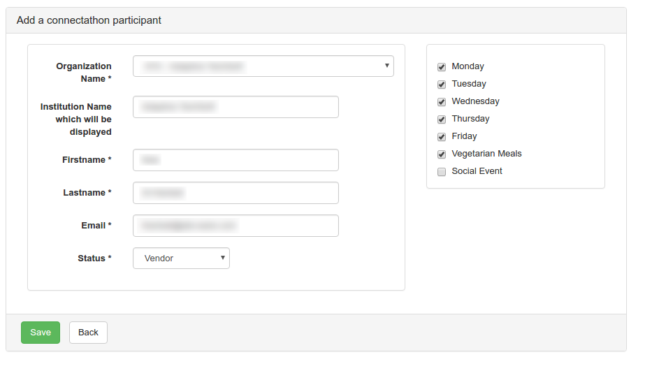 A participant can register for some connectathon days, specify if he eats vegetarians and if he will attend the social event.