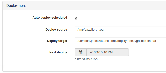 The deploy section allows to schedule deployment of gazelle TM ear into a jboss server. This section contains 4 elements: