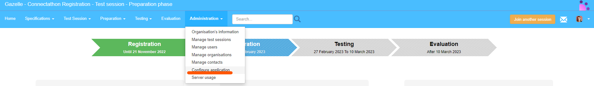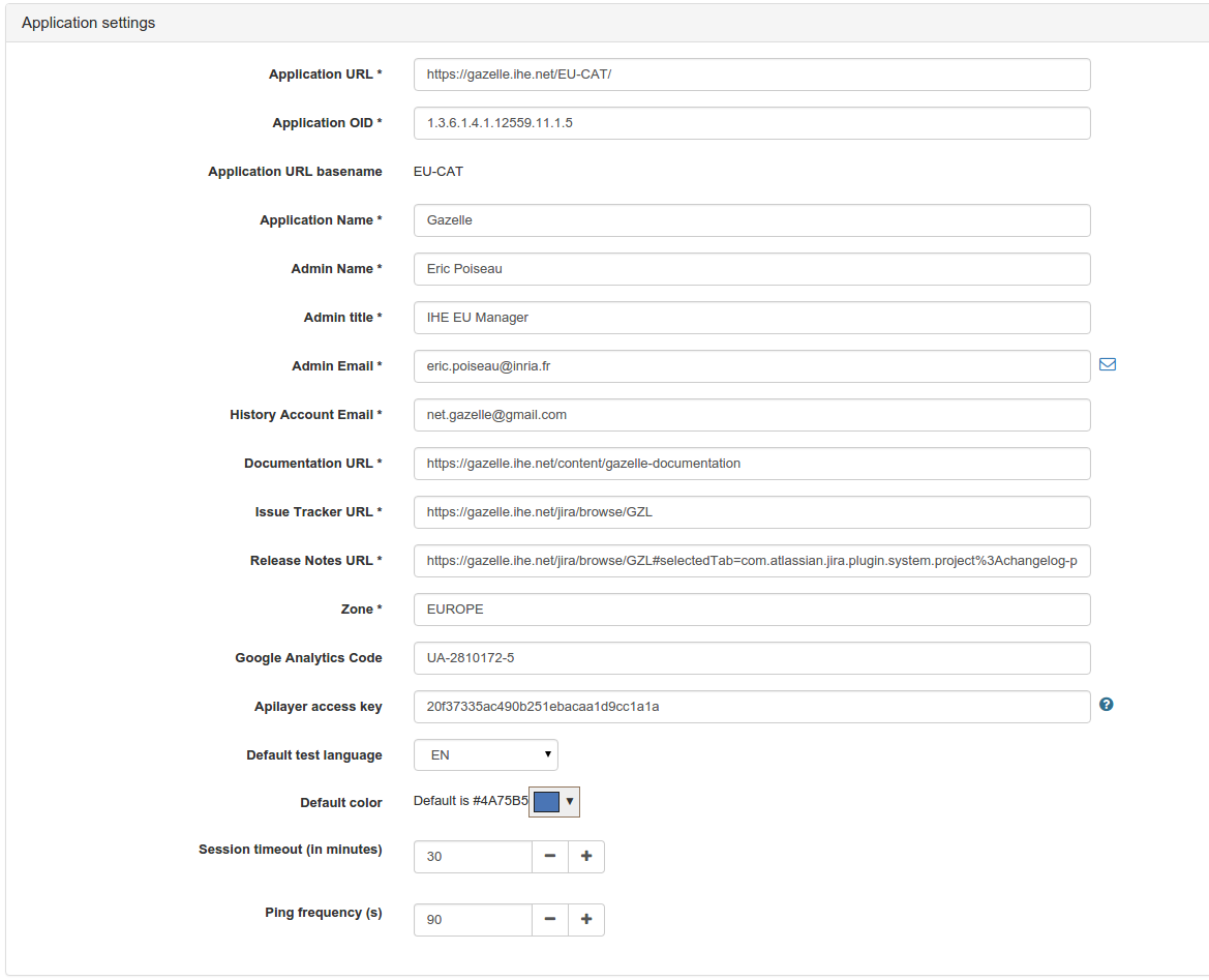 The configuration of gazelle TM is done through the menu Administration→ Application Preferences