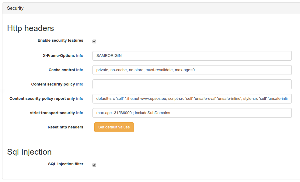 | X-Content-Security-Policy-Report-Only | String | default-src ‘self’*.ihe.net; script-src ‘self’ ‘unsafe-eval’ ‘unsafe-inline’; style-src ‘self’ ‘unsafe-inline’; | To verify that the content of the site is provided only by domain specified (trusted domain) (report only!) |