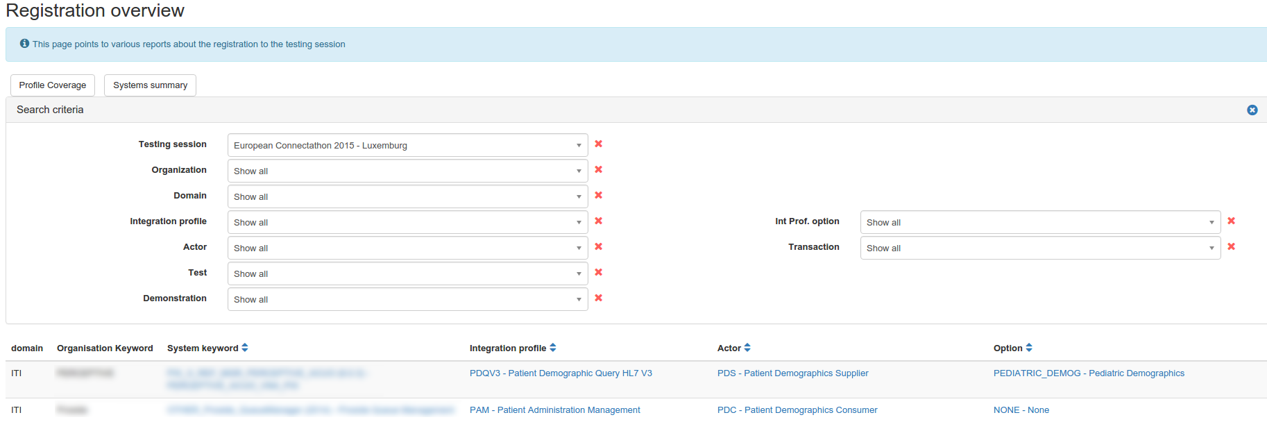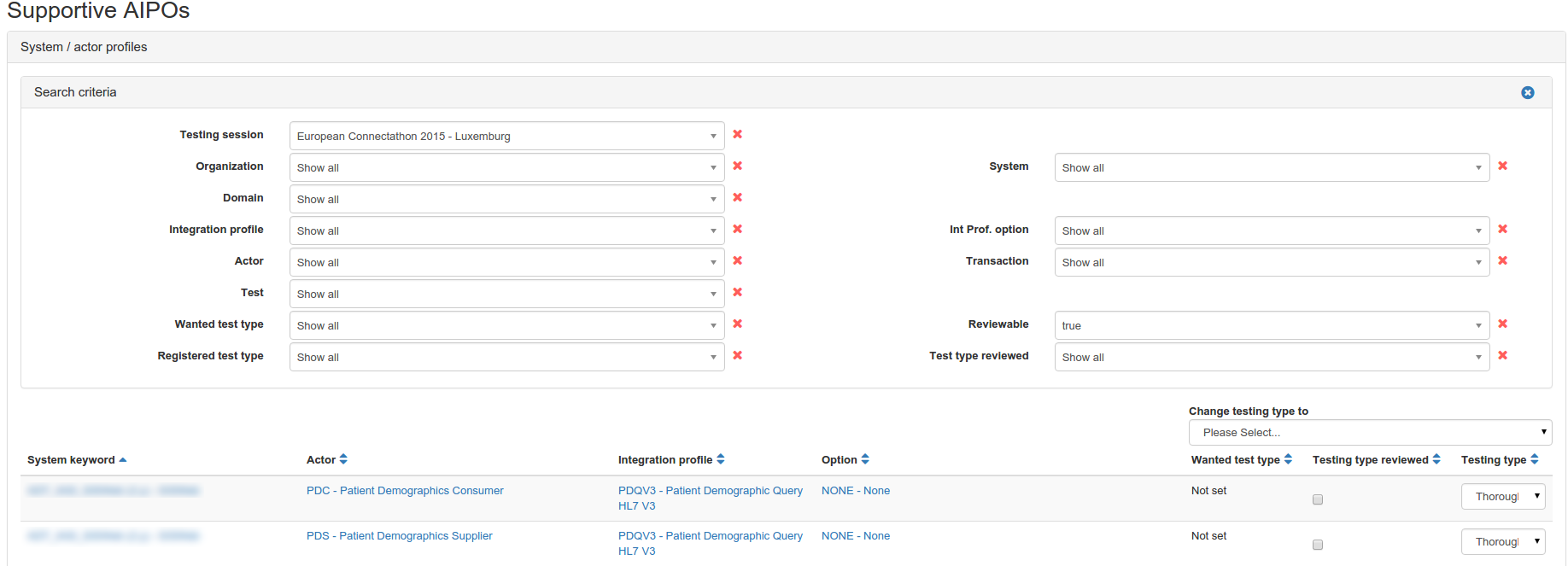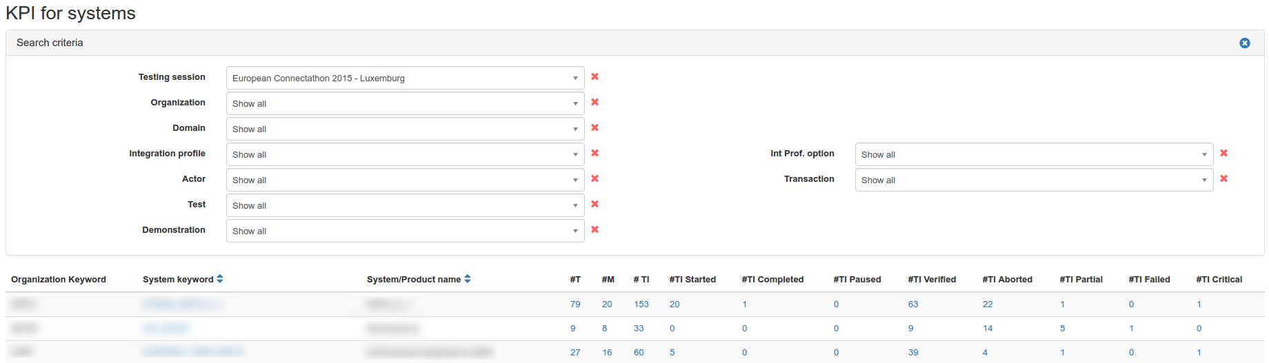 In the table, a line is displayed for each actor / integration profile / option (AIPO) tuple registered by a system; in Test Management, results are given at system level even if we usually communicate the results at company level.