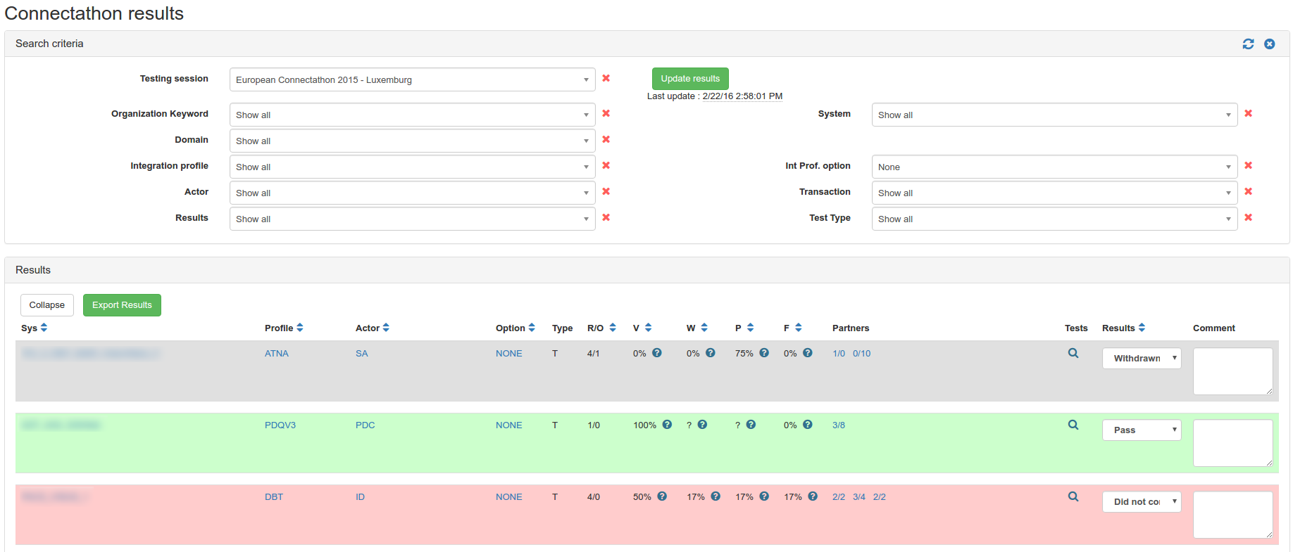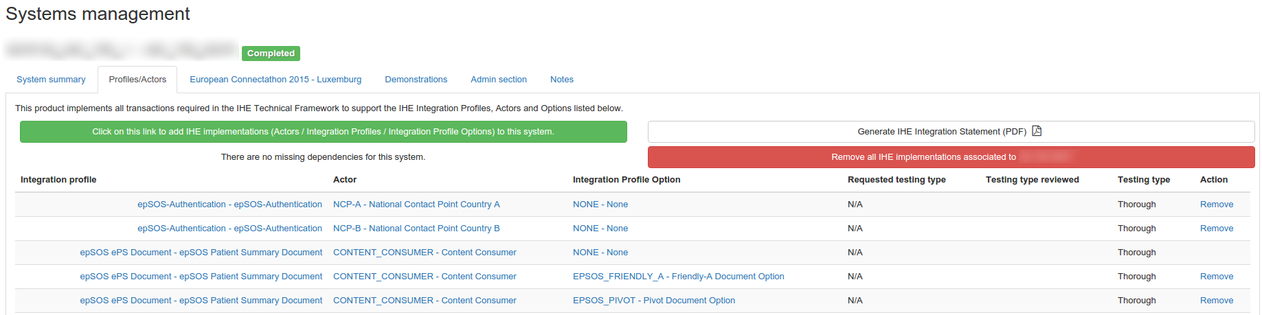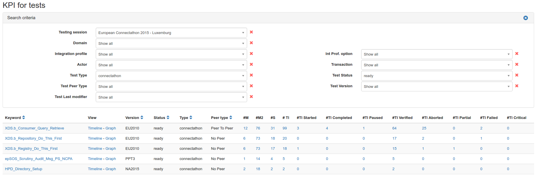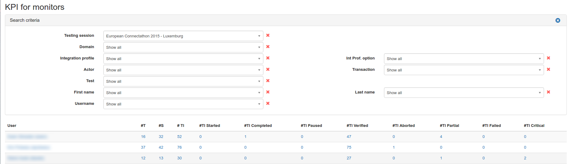 In the table, a line is displayed for each actor / integration profile / option (AIPO) tuple registered by a system; in Test Management, results are given at system level even if we usually communicate the results at company level.
