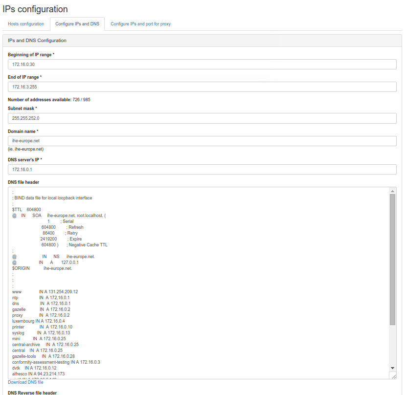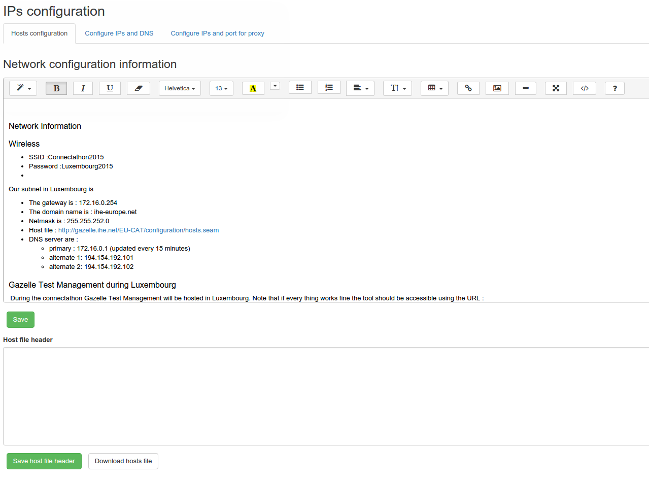 A network system configuration gives information to the user on how to configure their systems for the testing event and how to reach the systems of their partners for testing. Which type of configuration is requested by each actor is defined in Gazelle Master Model.