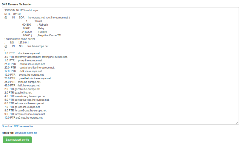 Here is an example of the file named.conf.ihe-zones as used at one of our event for illustration. Note that the file makes references to the 2 files created by the update_dns.csh script :