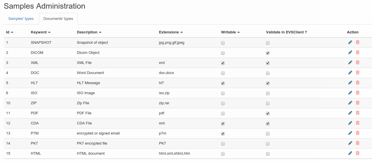 The module Sample management contain two panel : sample type management and document type management.