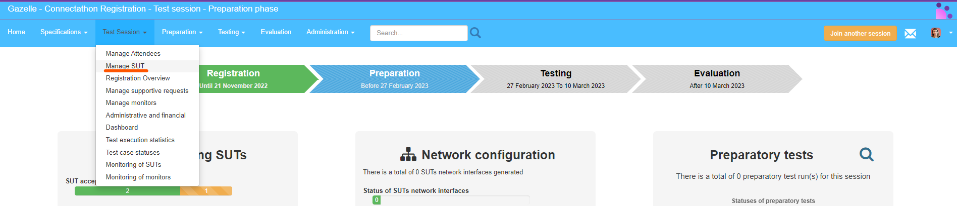 The monitors are the persons who are present during the testing event to verify the tests performed by the SUT operators. The recruitment process is not descibed there neither the work of the monitor. This section focuses on how to set persons as monitor, how to say to which testing session they attend and how to create their list of tests, it means, what are the tests they will have to verify during the event.