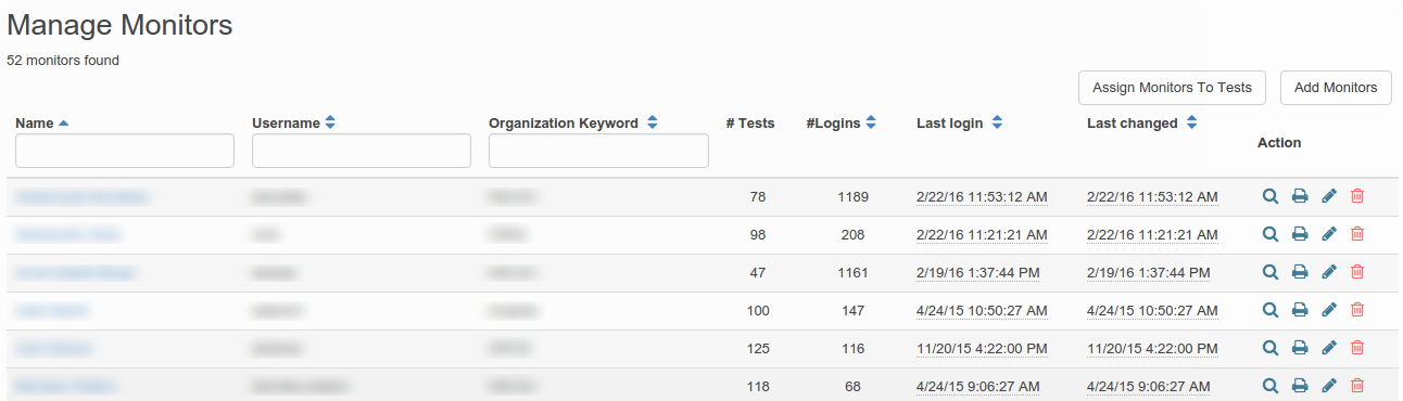 In the last column, buttons are available to view the detail of a monitor test list, print this test list, edit it or unassign the user from the list of monitors (the red cross).
