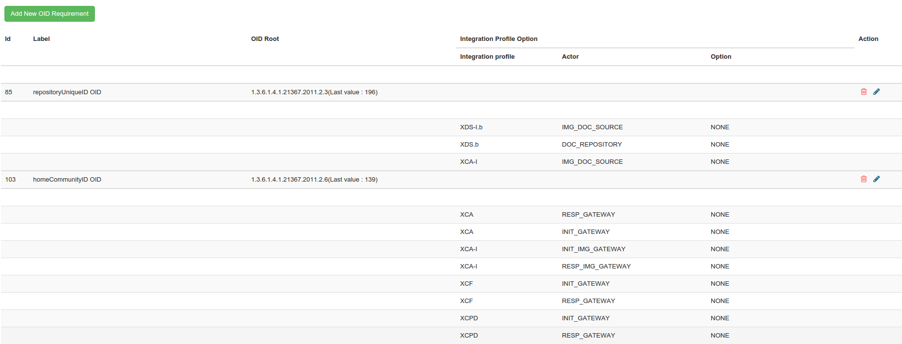 This section allows the administrator of the tool to define for which actors OIDs need to be defined and what this OID will be used for. You can edit, delete or create requirements. Before creating a new requirement, if you intent to use an OID different from the ones already used, first jump to OID Roots tab to define a new OID. Note that those OID requirements are common to all the testing sessions.