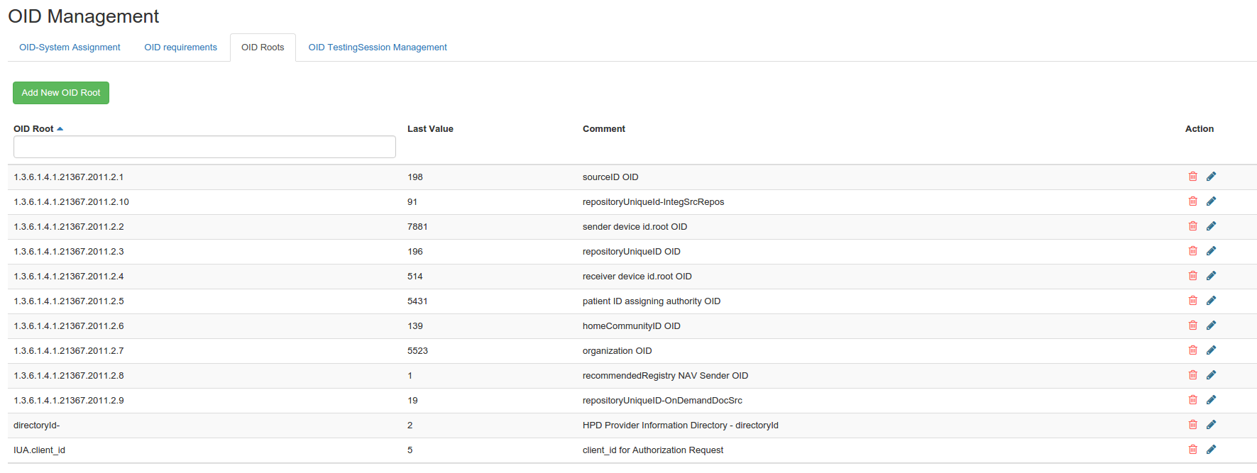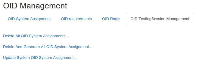 In this tab, you will find the list of OID roots assigned to the systems registered within the tool. You can filter the list by testing session; knowing that the testing session set when you accessed the page is the testing session you are currently logged into.