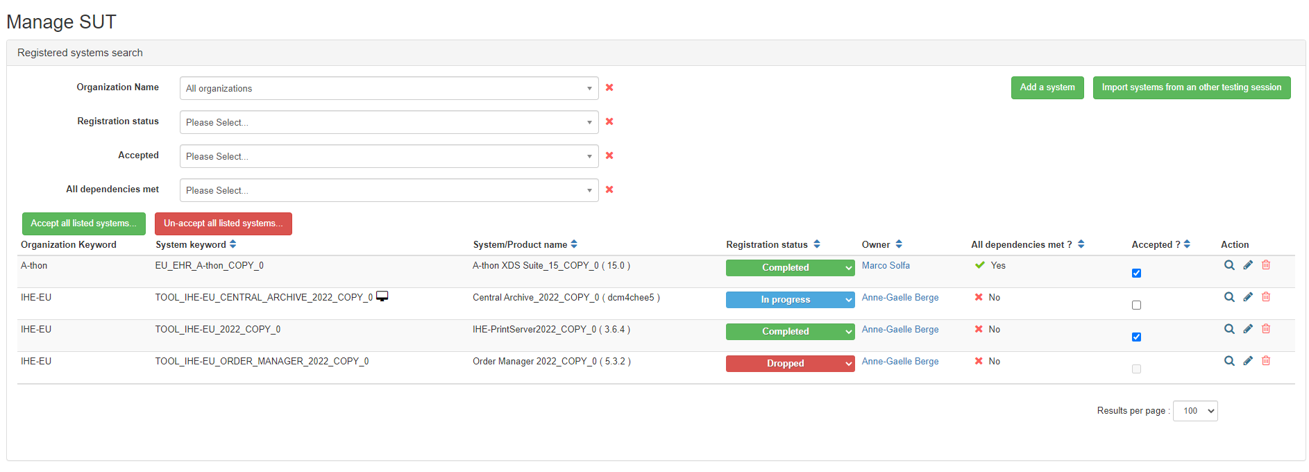 Evaluating the systems during a testing event is a manual process performed by the testing session managers. This section of the administration manual does not focus on the rules to grade system (they might be different depending on the testing events) but it describes how to do it with Gazelle Test Management.